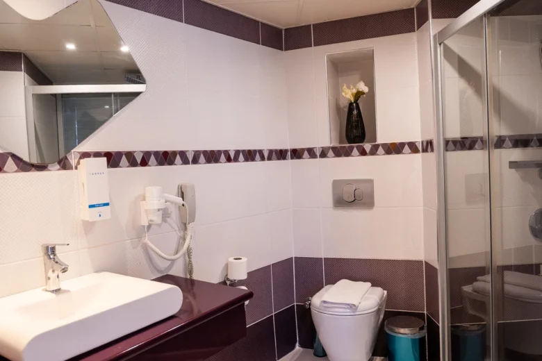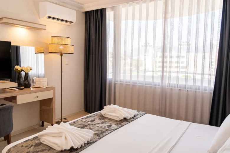 Şık ve fonksiyonel odamıza, çiftler için ideal bir konaklama deneyimi sunar. Konforlu yatak, özel banyo, klima ve ücretsiz Wi-Fi gibi olanaklarla rahat bir atmosfer sağlar.